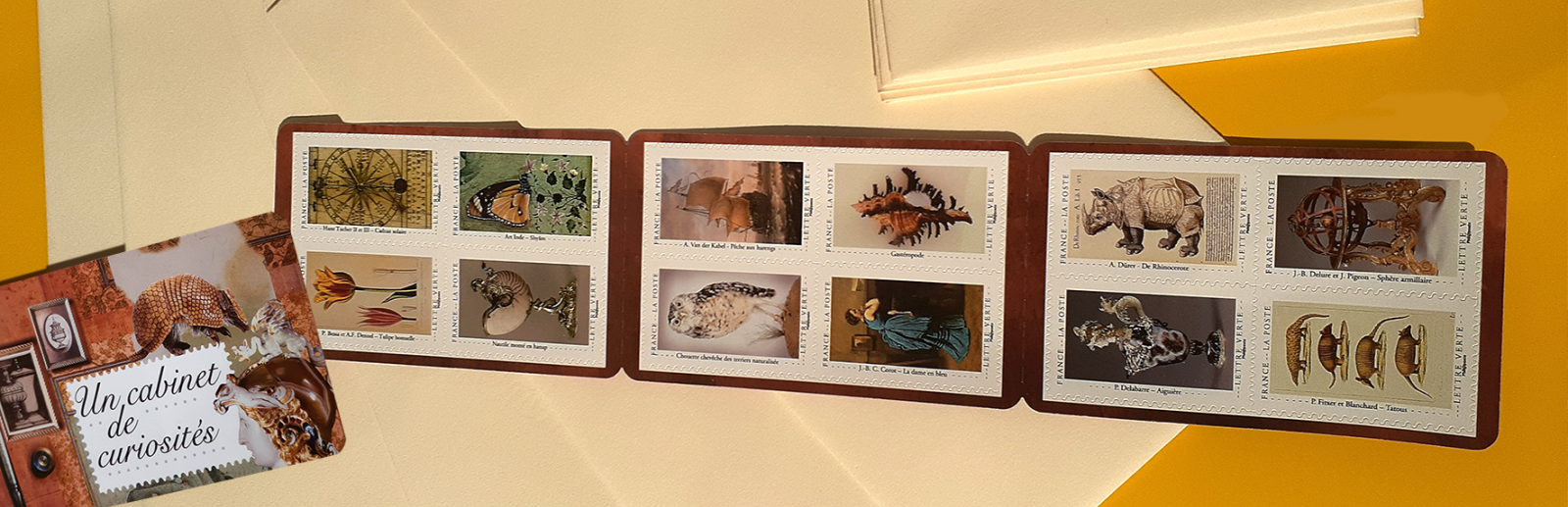 Pour envoyer une petite carte à vos proches durant les fêtes, pensez à vous procurer des timbres ! Et plutôt des timbres qui sortent de l’ordinaire, pour marquer une attention particulière. Pourquoi pas ce carnet « Cabinet de curiosités », 12 objets, peintures, dessins qui ont conservé le caractère un peu magique qu’ils avaient jadis, quand ils trônaient en bonne place dans des collections privées.