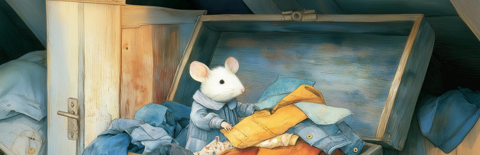 Dans le grenier de Mamy, Kiki la petite souris découvre une malle remplie de vêtements de travail, chacun porteur d’histoires et de souvenirs !